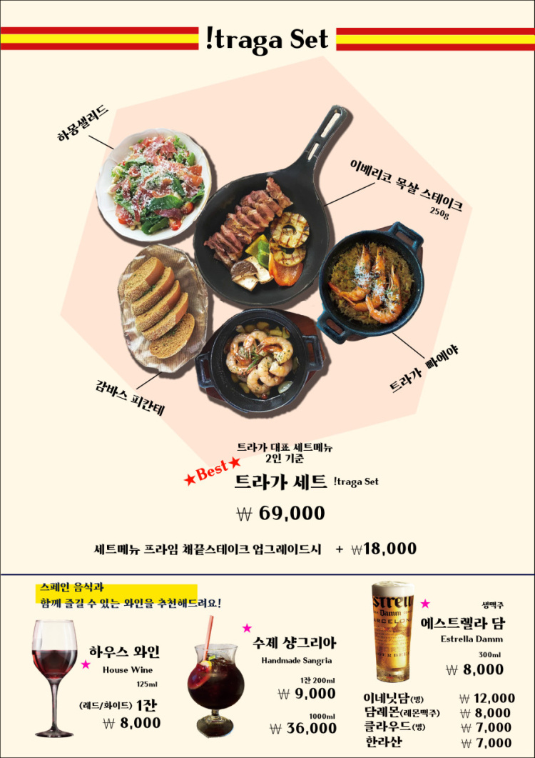 - 먹은 메뉴는 트라가 세트 + 샹그리아다. 남자 두명이서 먹어야 했기에 양이 모자라지 않기를 원했다.